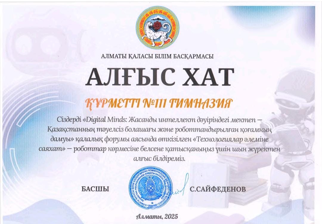 2025 жылдың 26 қарашасында «Digital Minds: Жасанды интеллект дәуіріндегі мектеп — Қазақстанның тәуелсіз болашағы және роботтандырылған қоғамның дамуы» атты қалалық форум өтті.